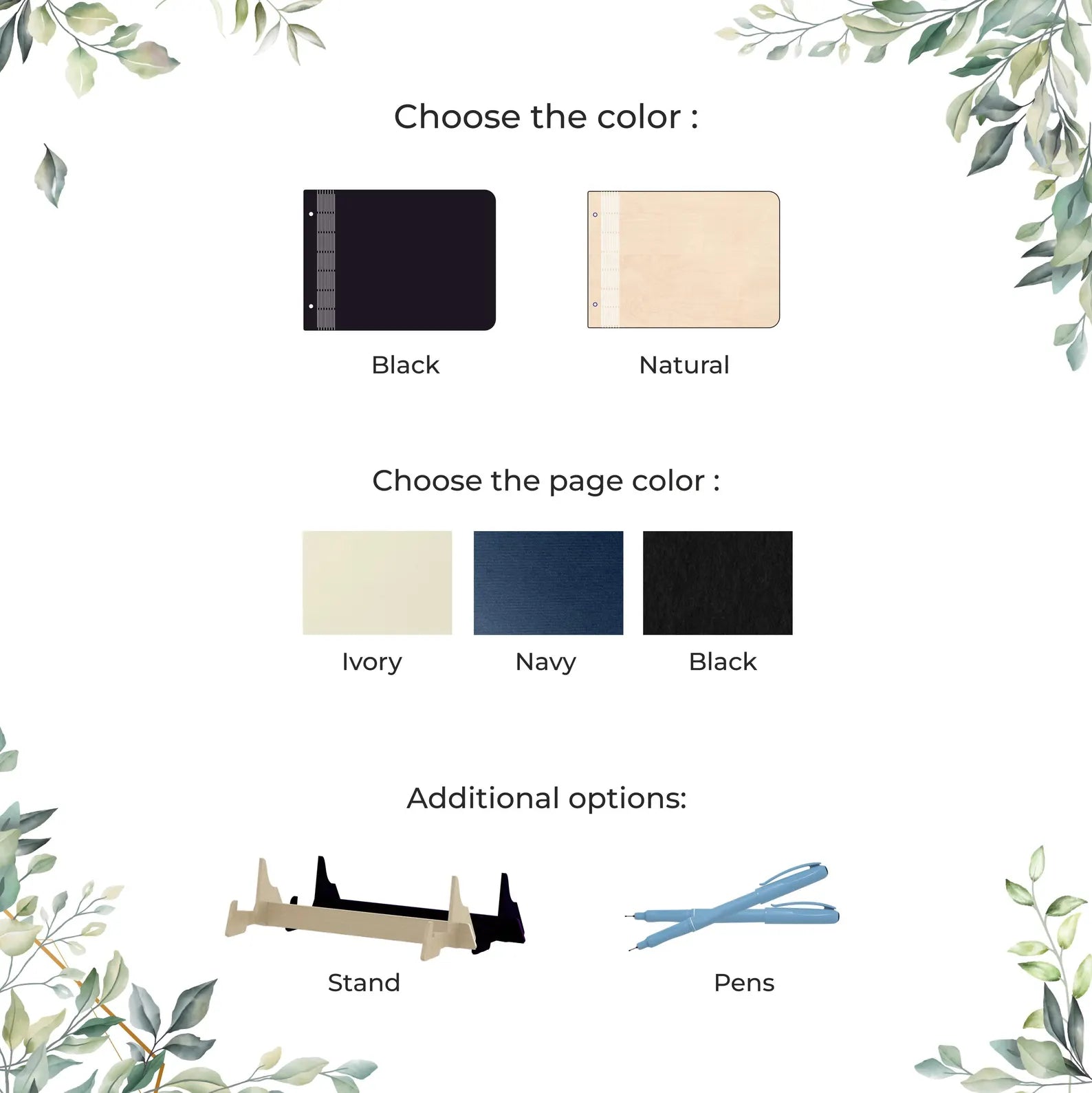 Choisissez parmi les couleurs proposées pour votre livre d'or : bois naturel ou noir. Pour mettre en valeur le design choisi.