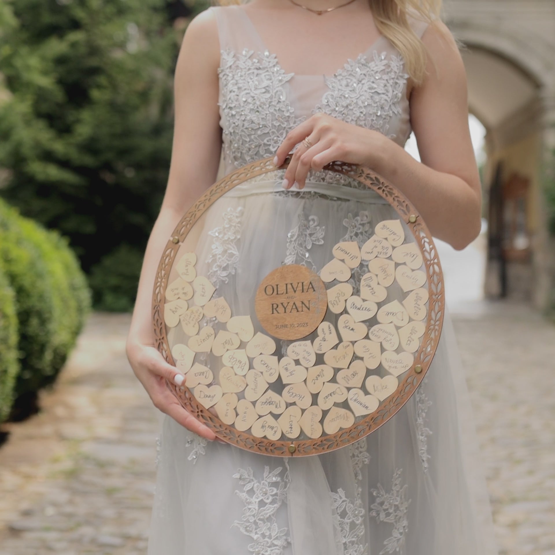 Handcrafted Wooden Decor — Personalized, Timeless, Yours ❤ Dites « non » aux idées de livre d'or ennuyeuses ! Optez pour cette magnifique alternative. Cette pièce unique impressionnera à coup sûr tous les invités. Vous la conserverez précieusement pour immortaliser les beaux souvenirs de votre mariage. Demandez à vos invités de signer un cœur et de le glisser dans le cadre en verre.