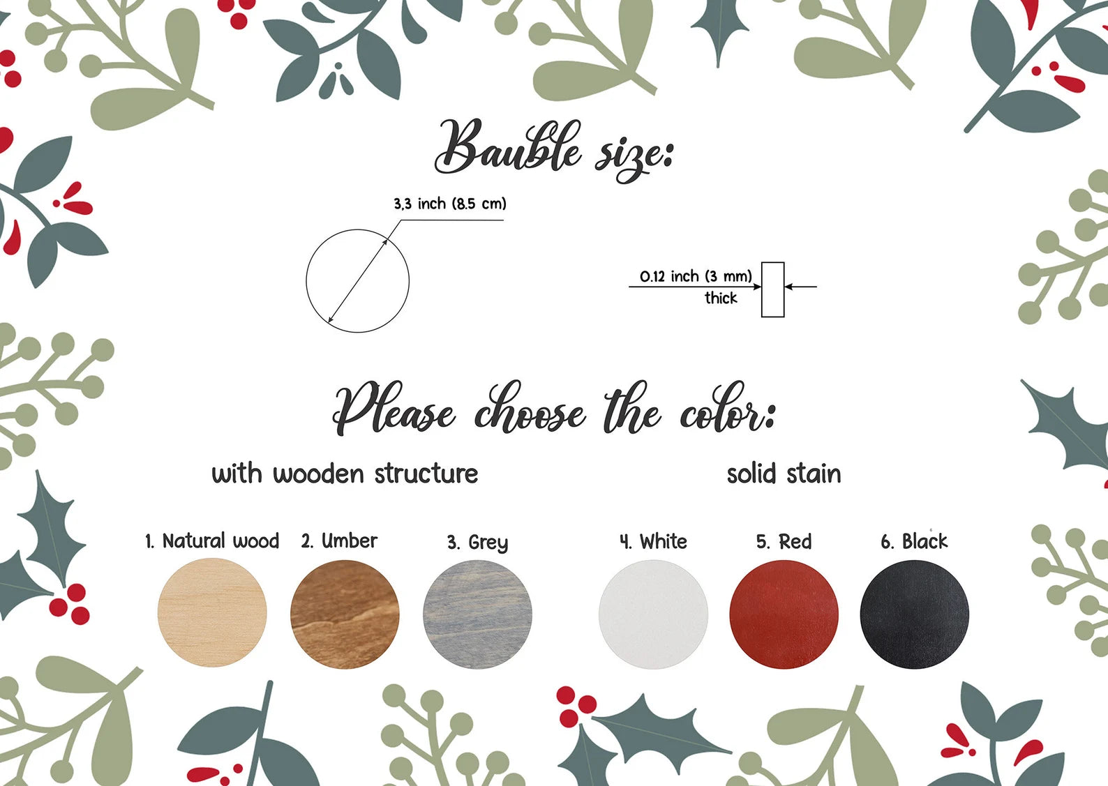 Each ornament is crafted from natural wood and finished with care to preserve its organic texture and cozy rustic appeal. CHRISTMAS custom baubles are carefully made from premium Baltic birch. They can be produced in several color options and will perfectly fit your Christmas home décor.